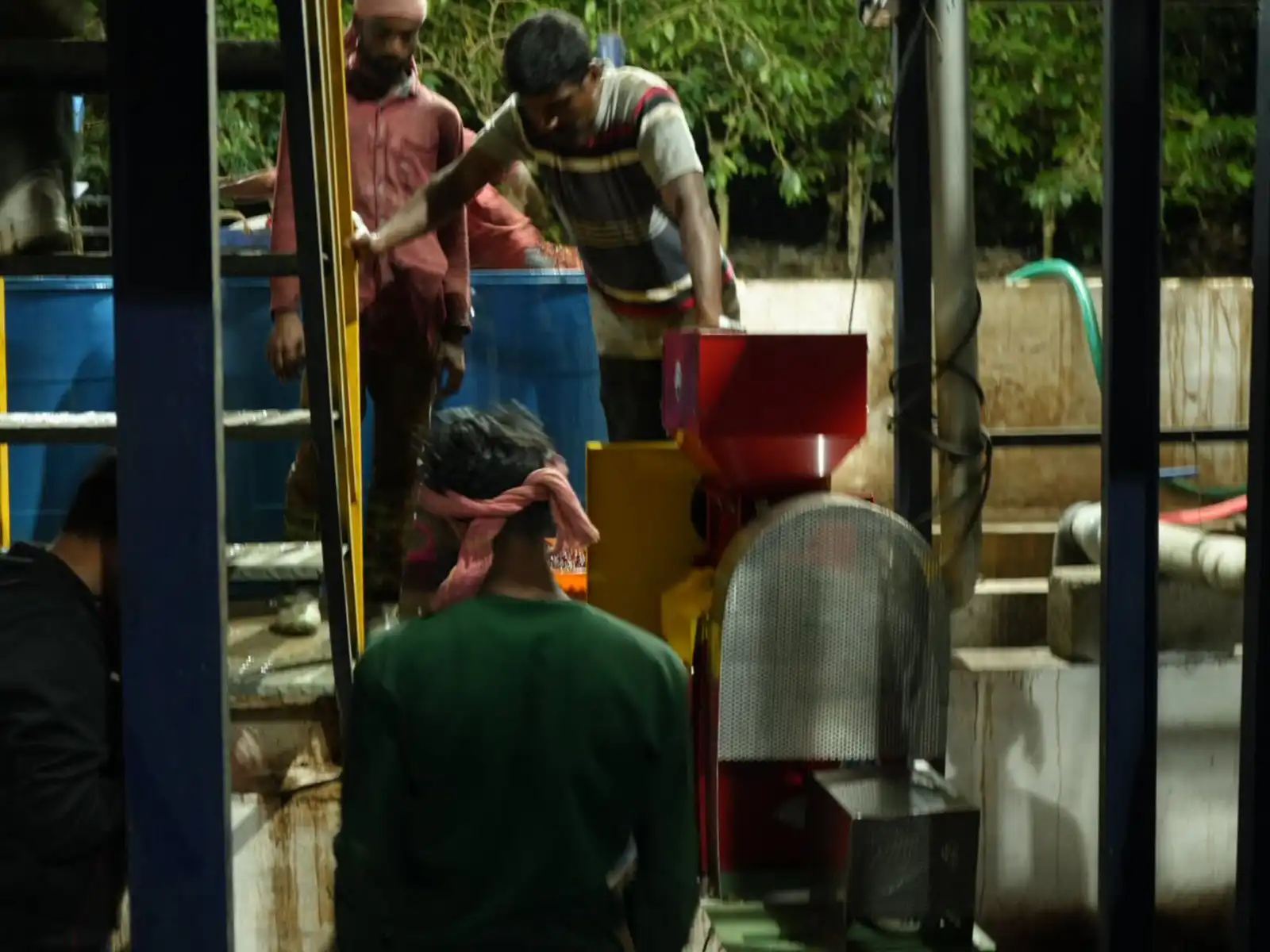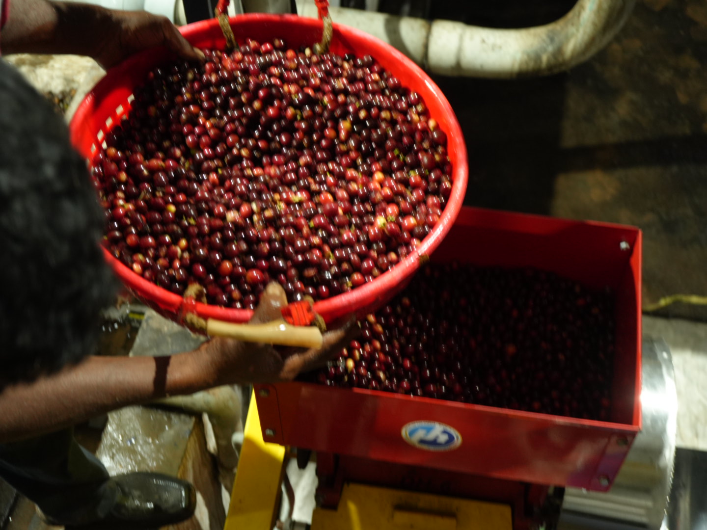 収穫時にいたピッカーさんたちは夕方には帰り、遅番の男性スタッフが中心となって精製を担当。