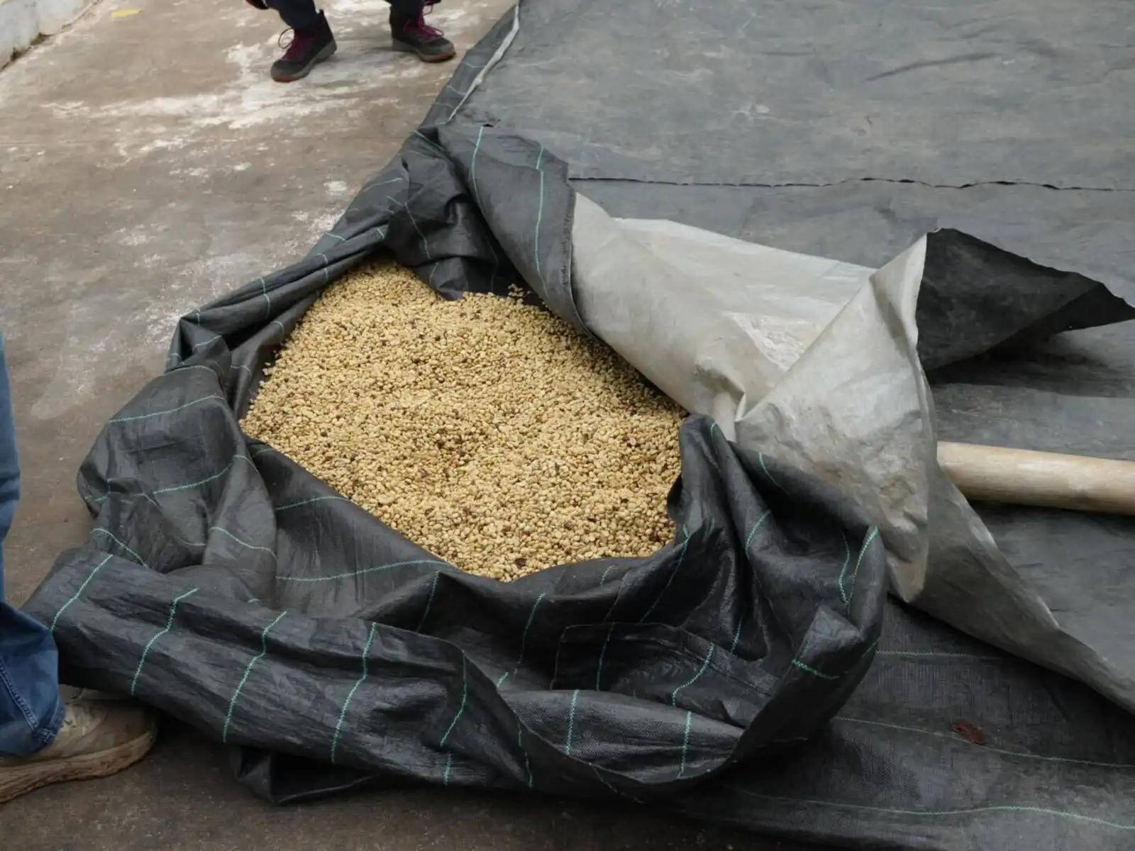 コモディティはコンクリートパティオ、スペシャルティコーヒーはビニールハウス内のレイズドベットで乾燥。