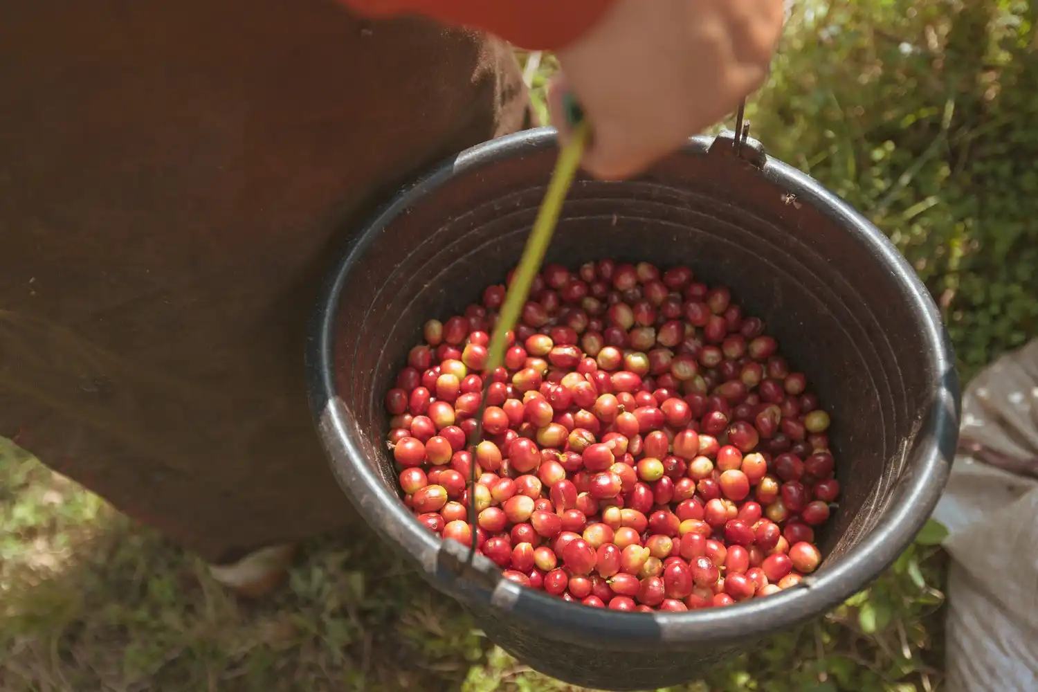 収穫されたコーヒーチェリーを水槽に入れると、未熟豆や虫食い豆などの密度の低い豆は浮く一方、完熟している豆は沈みます。