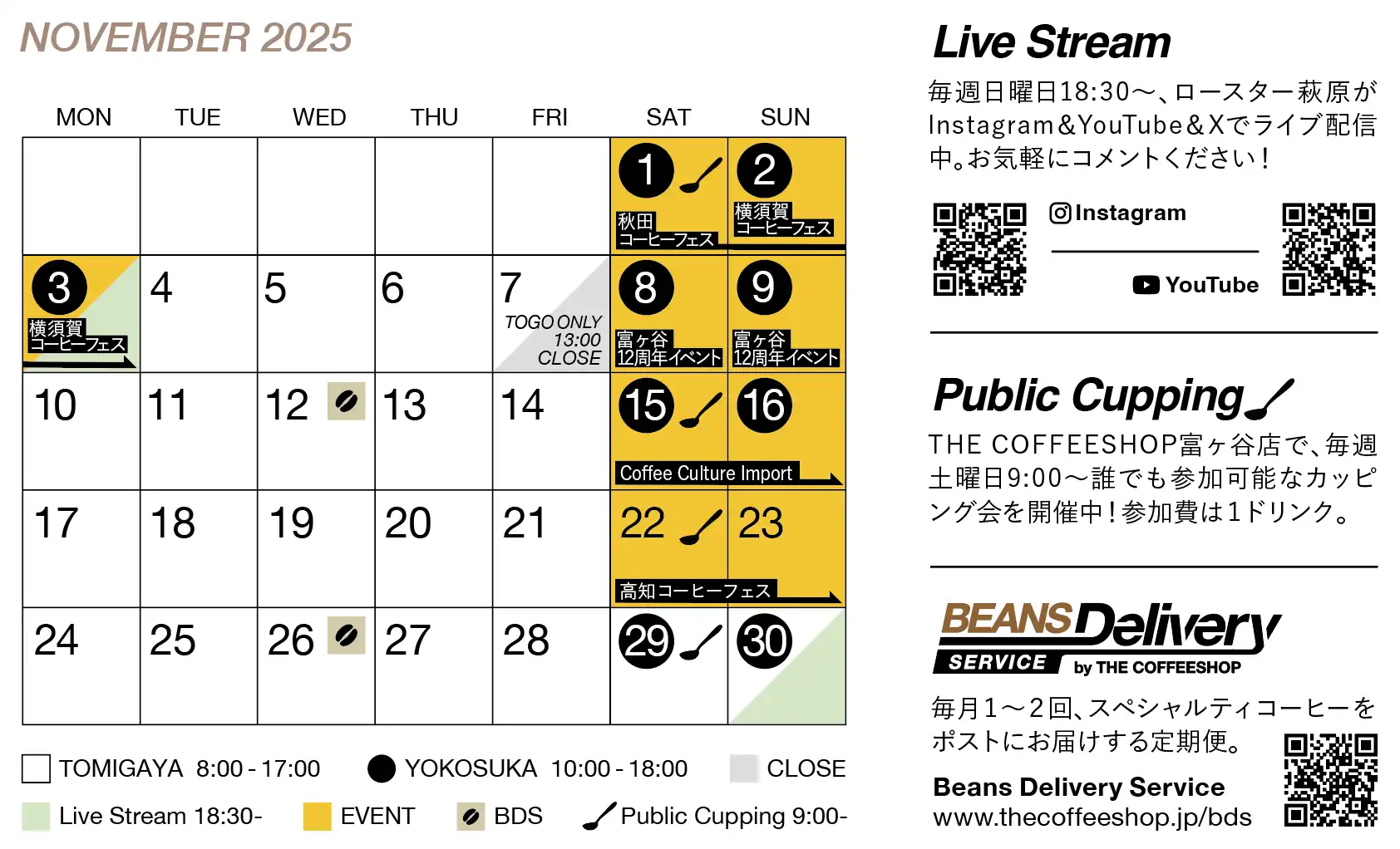 11月も週末はイベントづくし。秋田・愛媛・高知へは初出店!普段なかなか行けない地域の皆さまに私たちのコーヒーをお届けできるのが楽しみです。ぜひ会場でお会いしましょう!