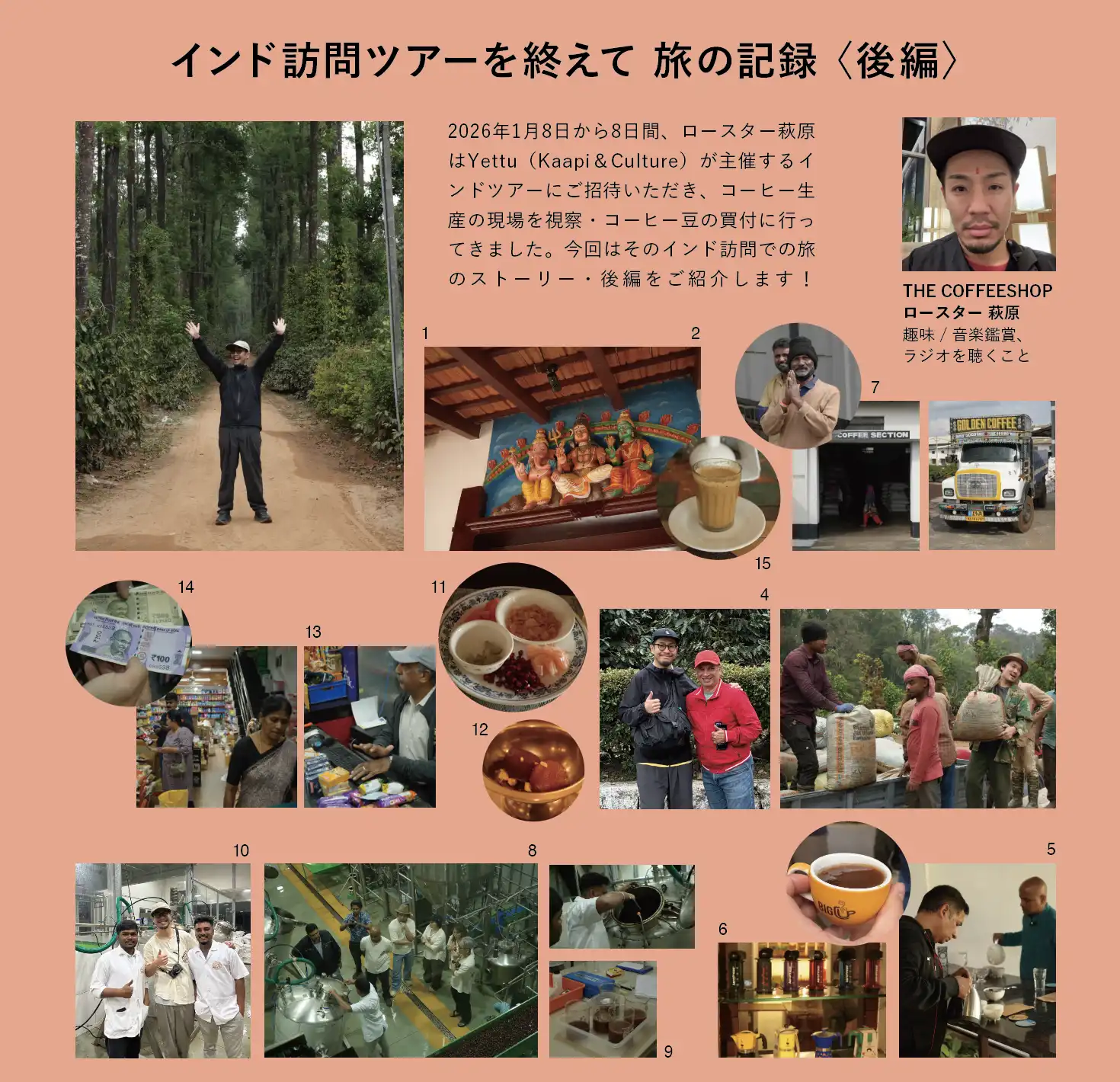 2026年1月8日から8日間、ロースター萩原はYettu(Kaapi&Culture)が主催するインドツアーにご招待いただき、コーヒー生産の現場を視察・コーヒー豆の買付に行ってきました。今回はそのインド訪問での旅のストーリー・後編をご紹介します!