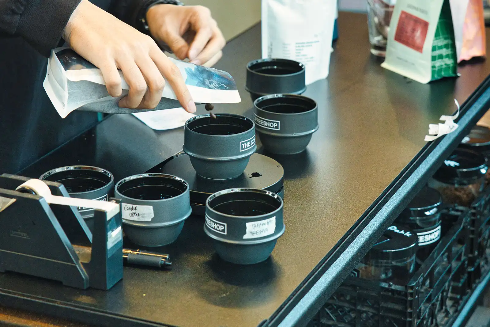 そもそもカッピングとは、コーヒー豆の品質や個性を客観的に評価するテイスティング手法のこと。規定の粒度に挽いた粉をカップに入れ、沸騰したお湯を注ぎ、4分間待ってから攪拌、出来上がった上澄みをスプーンですくって味わいます。
