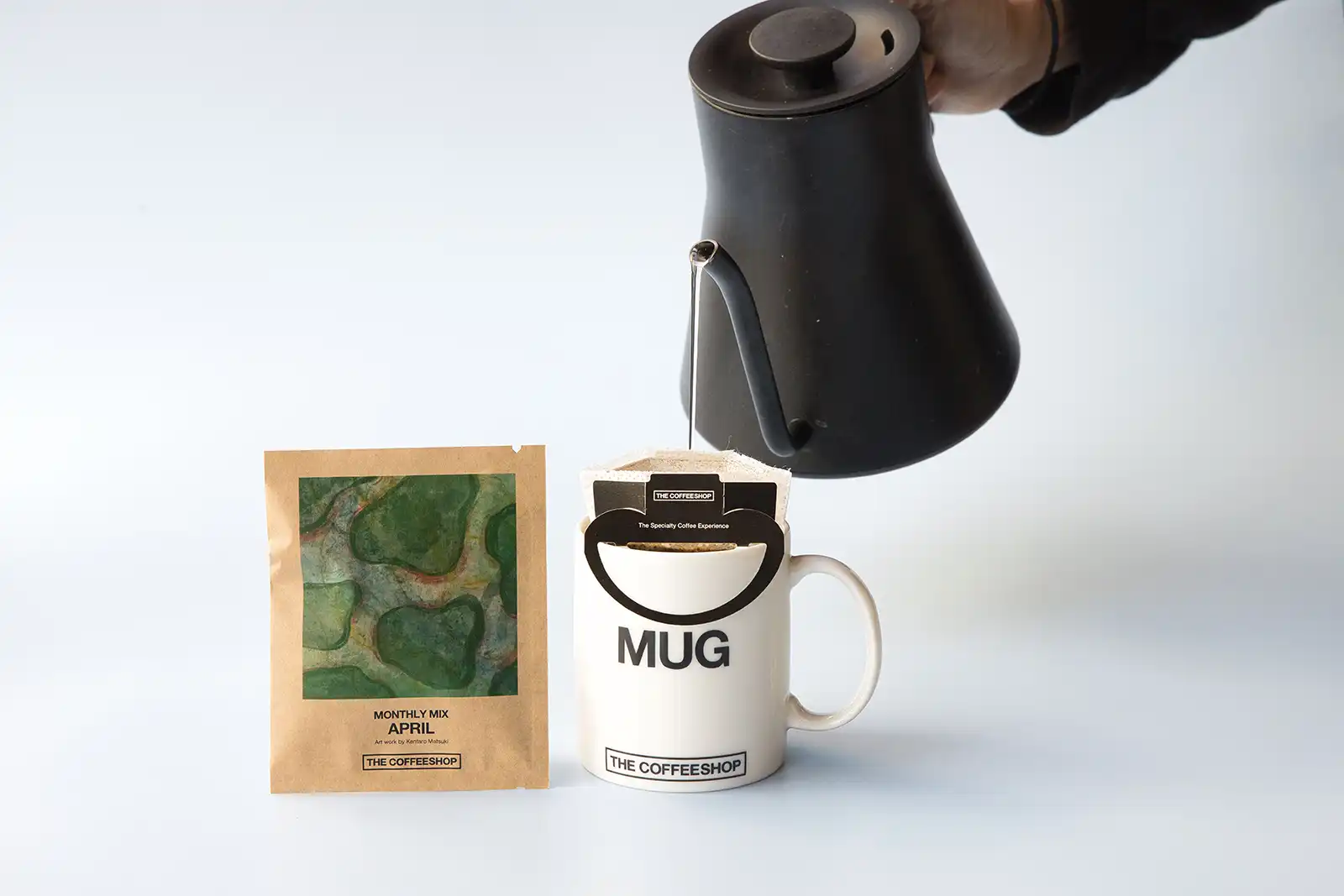マンスリーミックス限定のグラフィック入りパッケージに入った、ドリップバッグコーヒーの15個セットは【送料無料】でお届けします。