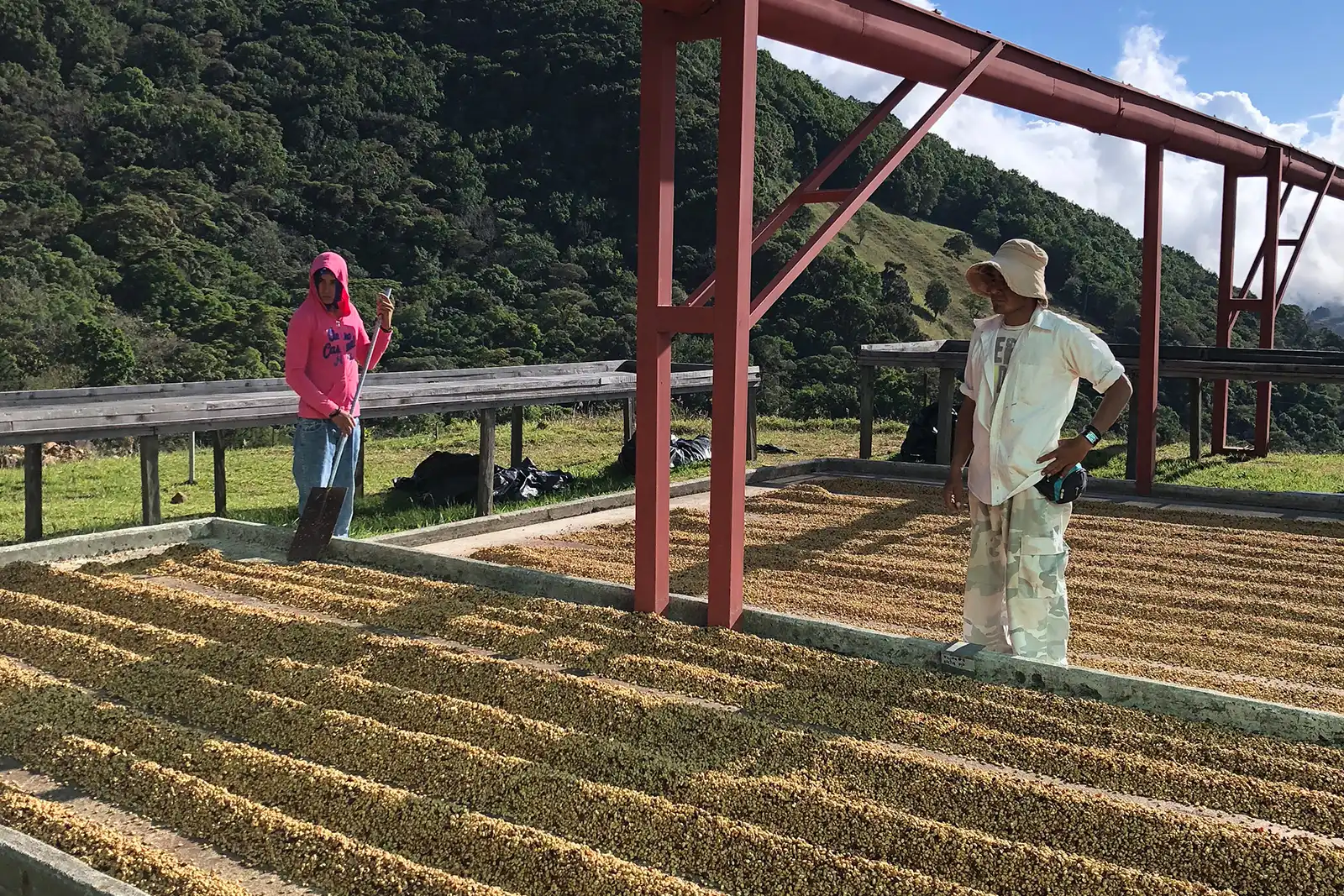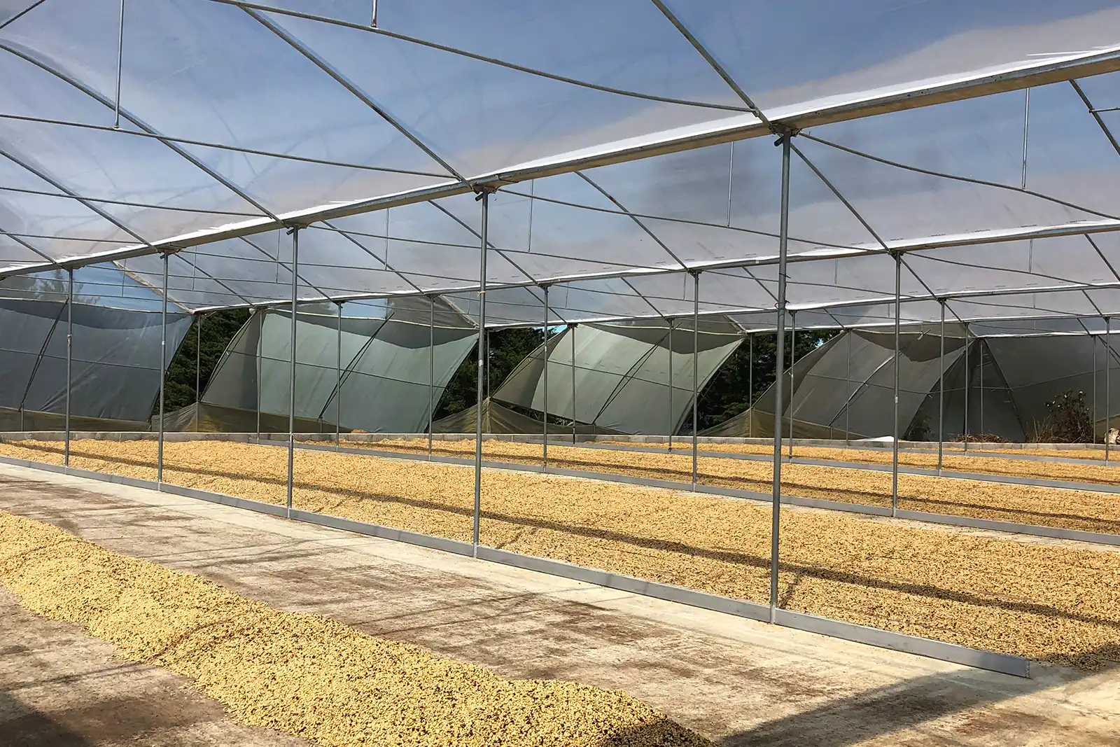 収穫は熟した赤いチェリーのみを選別し、高床式のアフリカンベッドに薄く広げて、16~18日間天日干しします。