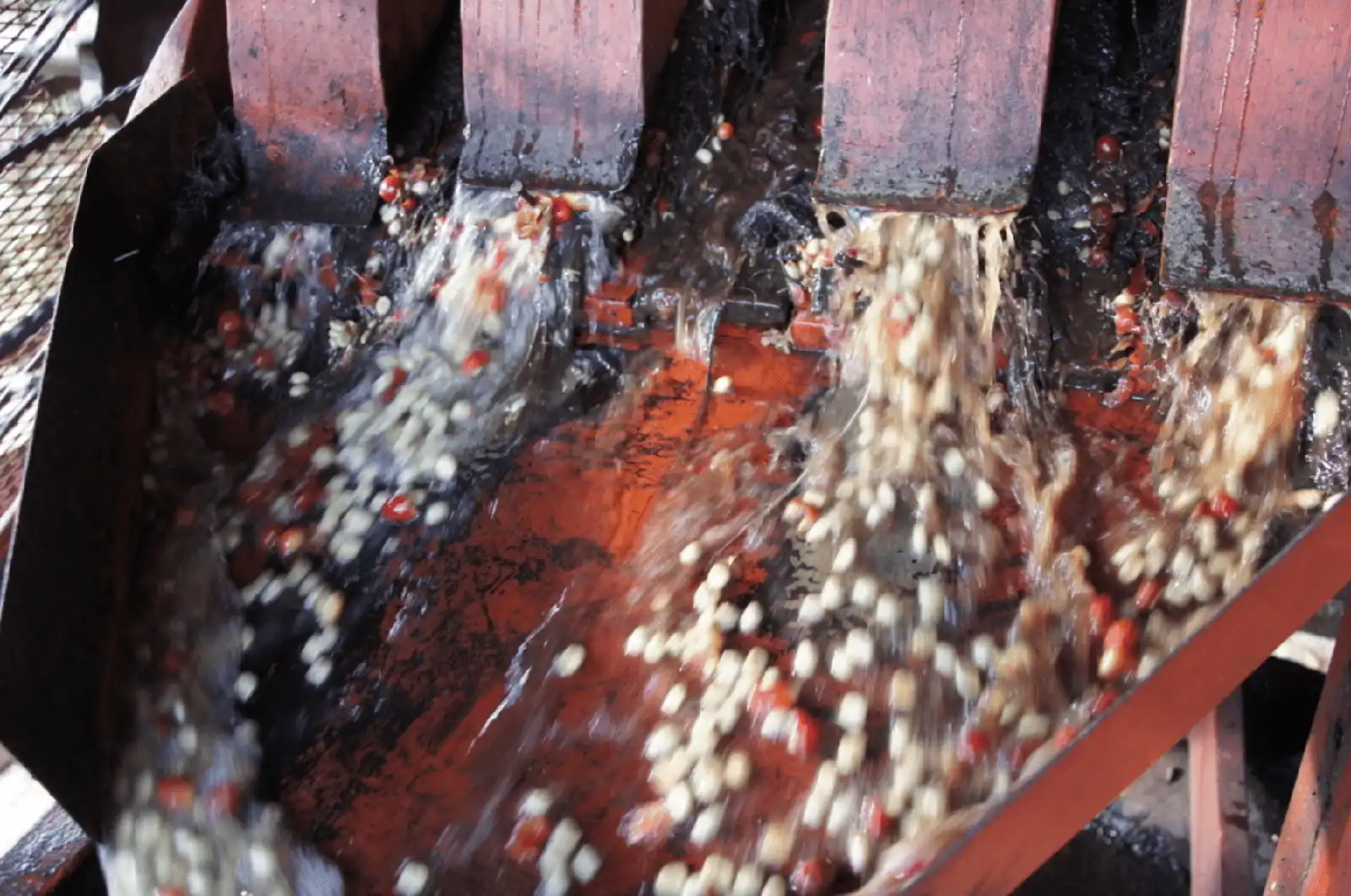 コーヒーは再び水路で選別され、密度の低い低品質のチェリーは浮かび上がり、除去されます。