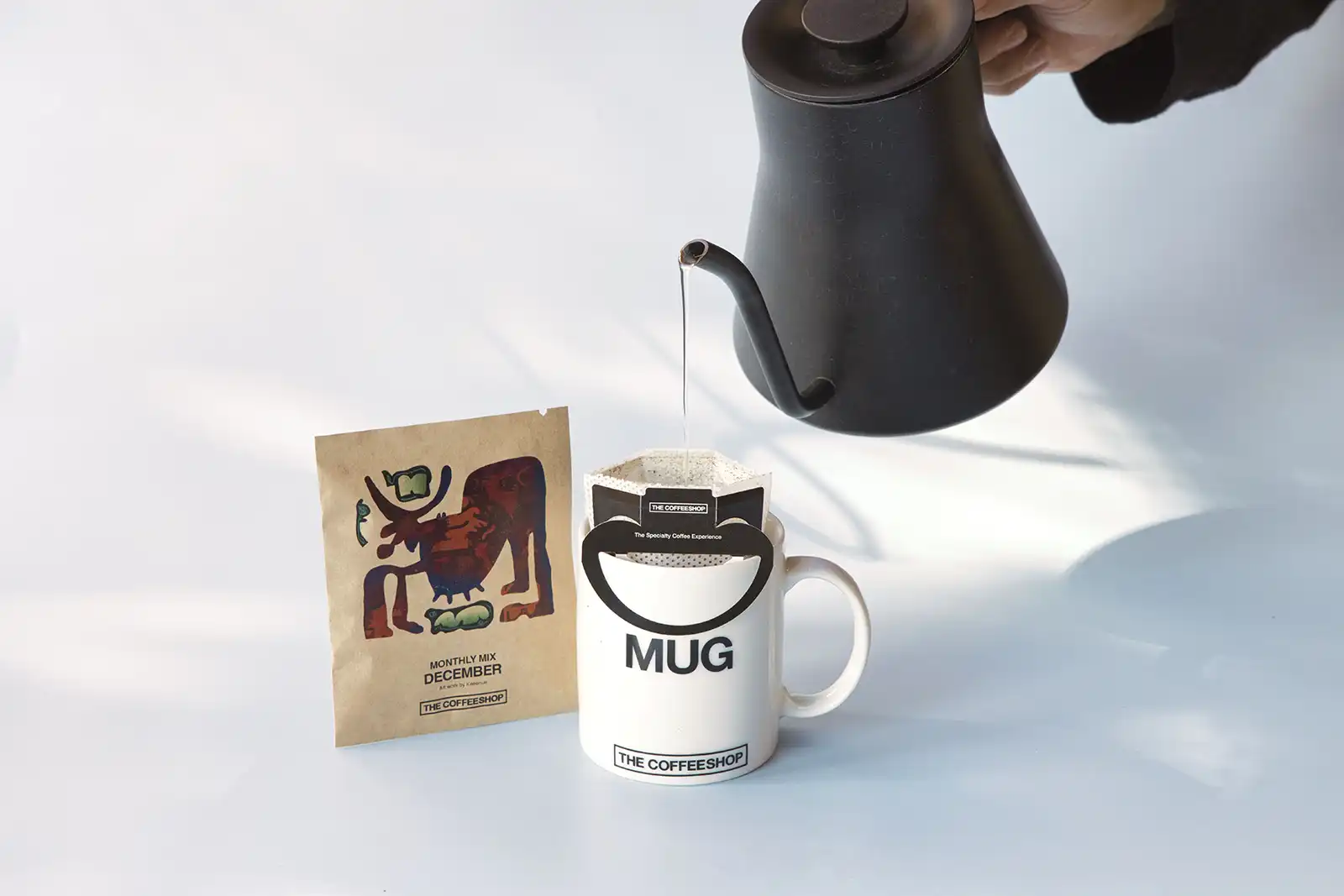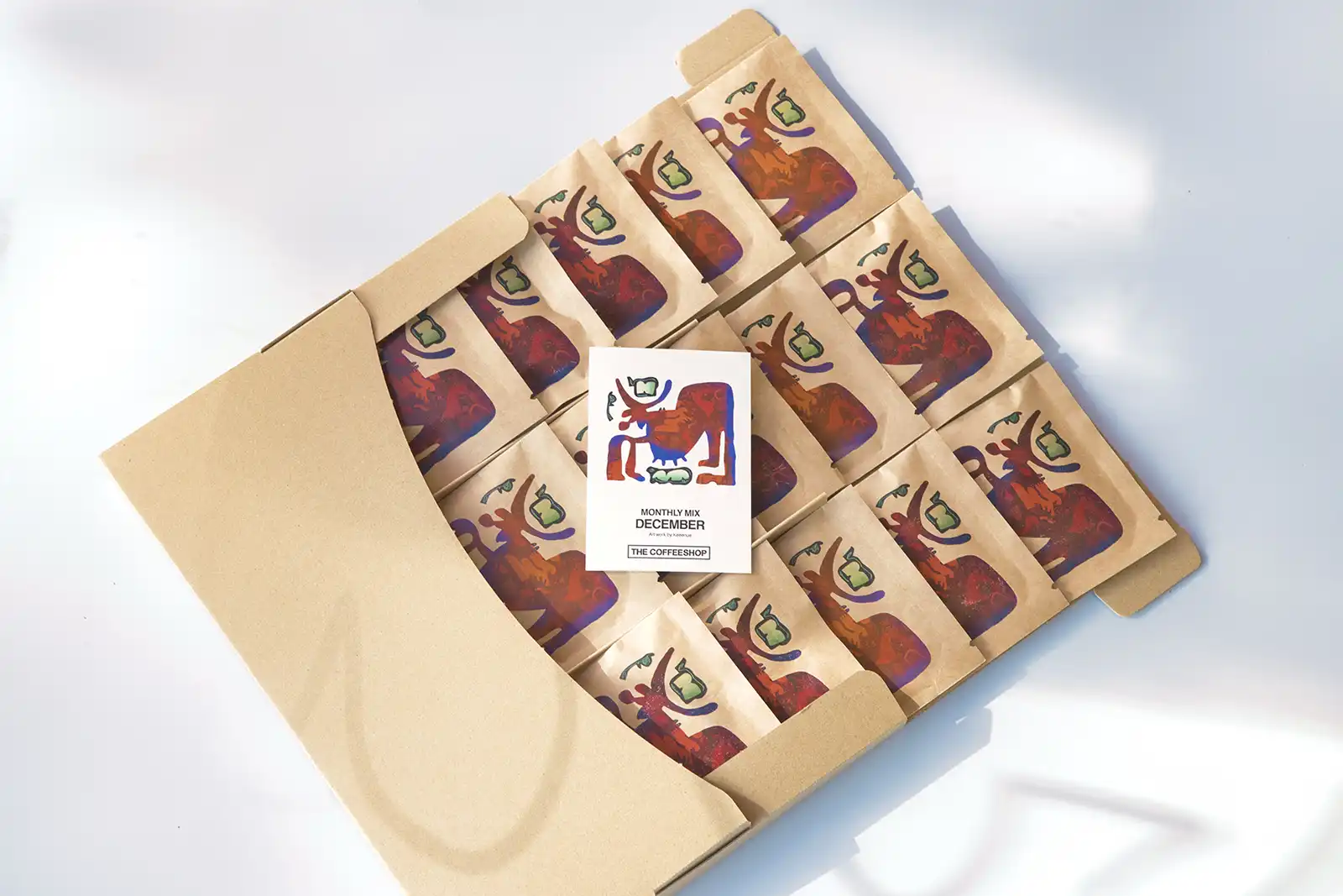 マンスリーミックス限定のグラフィック入りパッケージに入った、ドリップバッグコーヒーの15個セットは【送料無料】でお届けします。